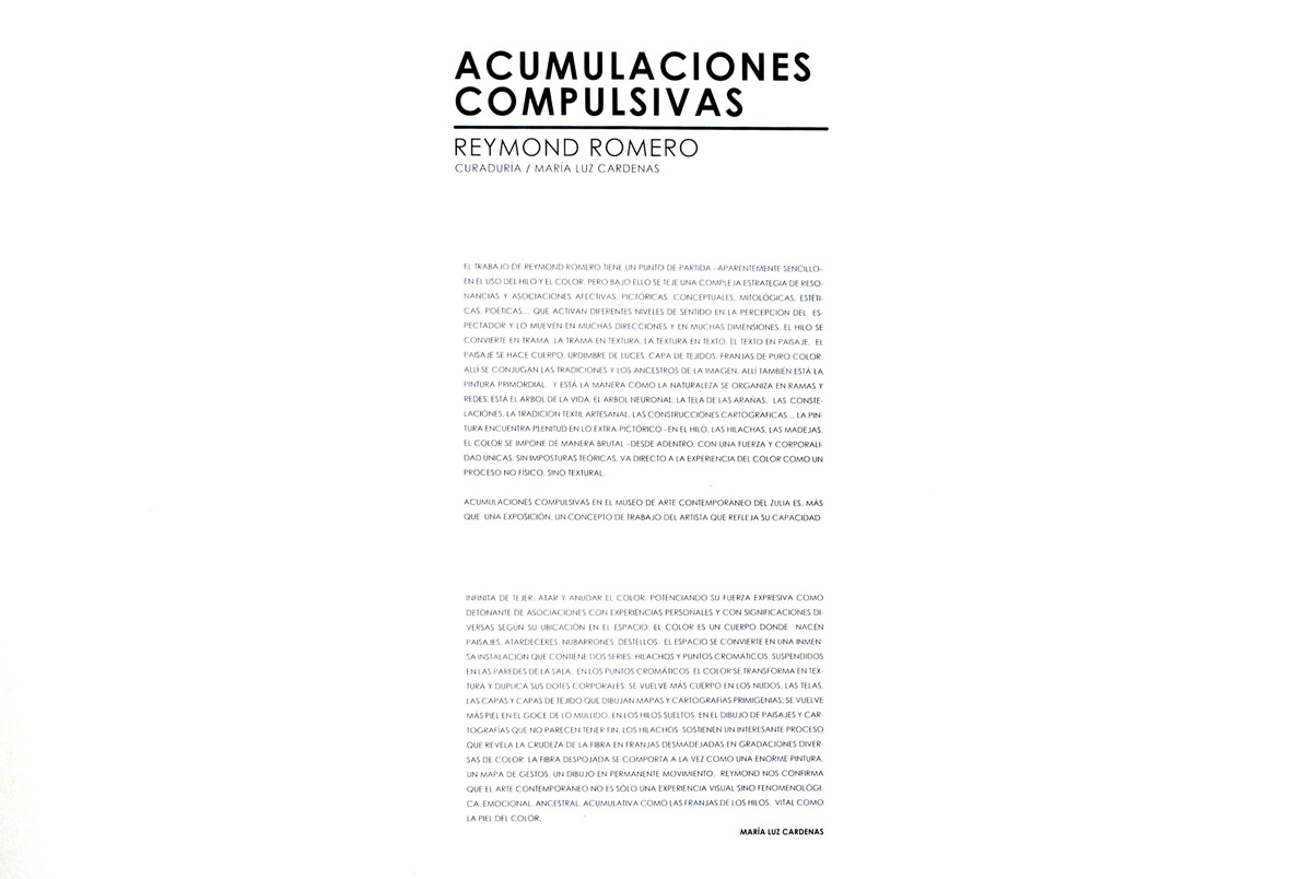 Portafolio — Exposiciones Acumulaciones Compulsivas 2 (2018) Lorem ipsum dolor sit amet, consectetur adipiscing elit. Más proyectos Flores Para Mi Tierra (2020)Acumulaciones Compulsivas 3 (2019)El Color que Vendrá (2014)Lecturas Cromáticas (2014)Acumulaciones Compulsivas 1Lucha Libre (2010)Vuelta (2011)Reymond Romero Instalación (2024)Antológica (2020)